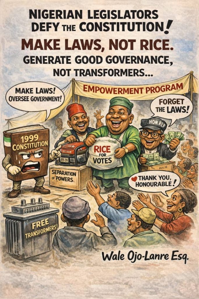 Nigeria is facing a quiet but profound democratic crisis—one not announced by coups, tanks, or decrees, but nurtured subtly by applause, poverty, misplaced expectations, and the steady erosion of constitutional understanding. It is a crisis of role confusion. Across the country today, legislators are increasingly celebrated not for the laws they make, the policies they influence, or the accountability they enforce, but for the quantity of rice, motorcycles, sewing machines, generators, and transformers they distribute. In this process, representative democracy has been reduced to charity, and constitutional governance has been mistaken for seasonal benevolence.