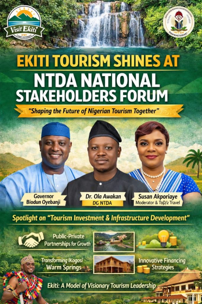 The remarkable strides recorded by the Ekiti State Government in tourism development under the visionary leadership of Governor Biodun Abayomi Oyebanji have received national recognition, as stakeholders at the National Hospitality and Tourism Stakeholders Forum organized by the Nigerian Tourism Development Authority (NTDA) spotlighted the state as a compelling model for policy-driven growth in Nigeria’s tourism sector.