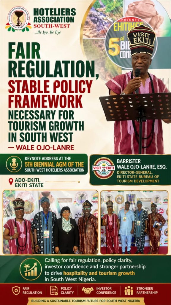 The Director-General of the Ekiti State Bureau of Tourism Development, Barrister Wale Ojo-Lanre, has called for a balanced regulatory framework, stable policy environment and stronger collaboration between government and hoteliers as essential conditions for sustainable hospitality growth in the South West region of Nigeria.