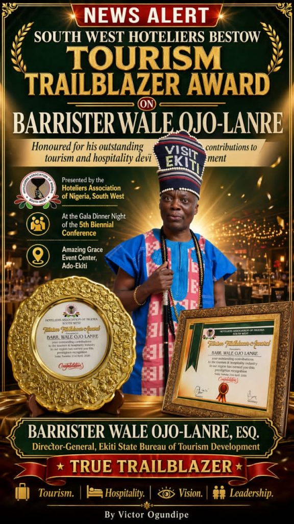 Barrister Wale Ojo-Lanre, Director-General of the Ekiti State Bureau of Tourism Development, has been honoured with the Tourism Trailblazer Award by the South West Hoteliers Association of Nigeria in recognition of his enduring contributions to tourism development and hospitality growth in Nigeria.